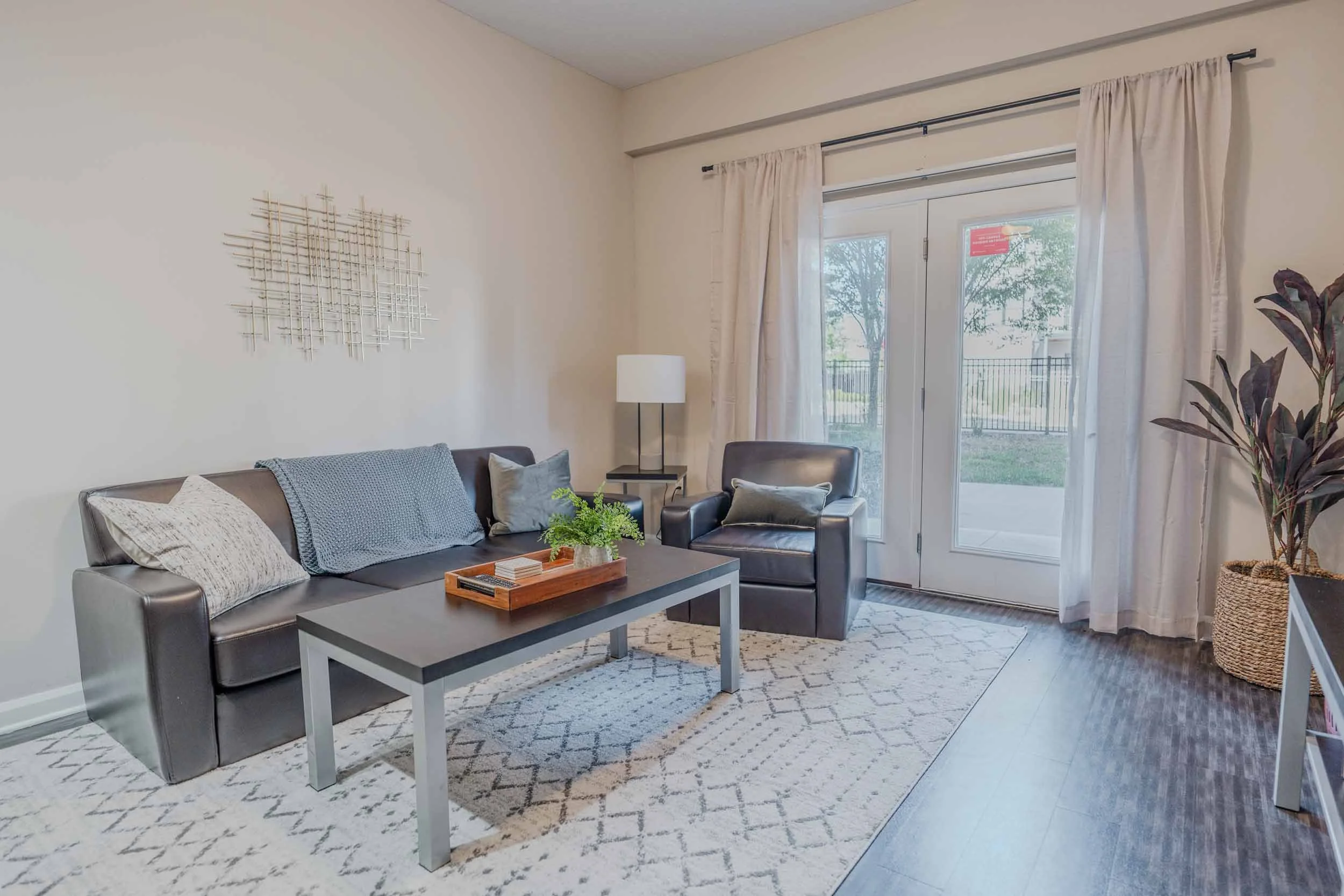 The Griff offers fully furnished apartments designed for convenience and comfort. The kitchens are equipped with black appliances, including a refrigerator, microwave, dishwasher, and in-unit washer and dryer. The living area features a couch, entertainment center, coffee table, and end tables. Each bedroom includes a full-size bed with a mattress, and a desk with a chair. Please note that you will need to bring your own dish ware, bedding, clothing, and any other personal items.